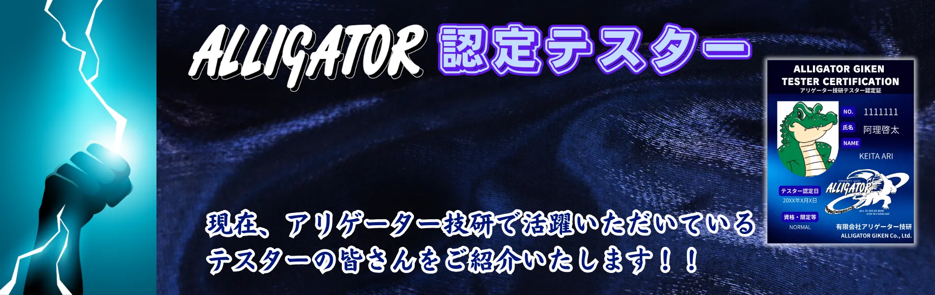 - アリゲーター技研認定テスター紹介現在、アリゲーター技研でご活躍いただいているテスターは、丸岡直樹さん、西岡孝晃さん、大城康平さん、白井亜実さん… 続きを読む: アリゲーター技研認定テスター紹介
